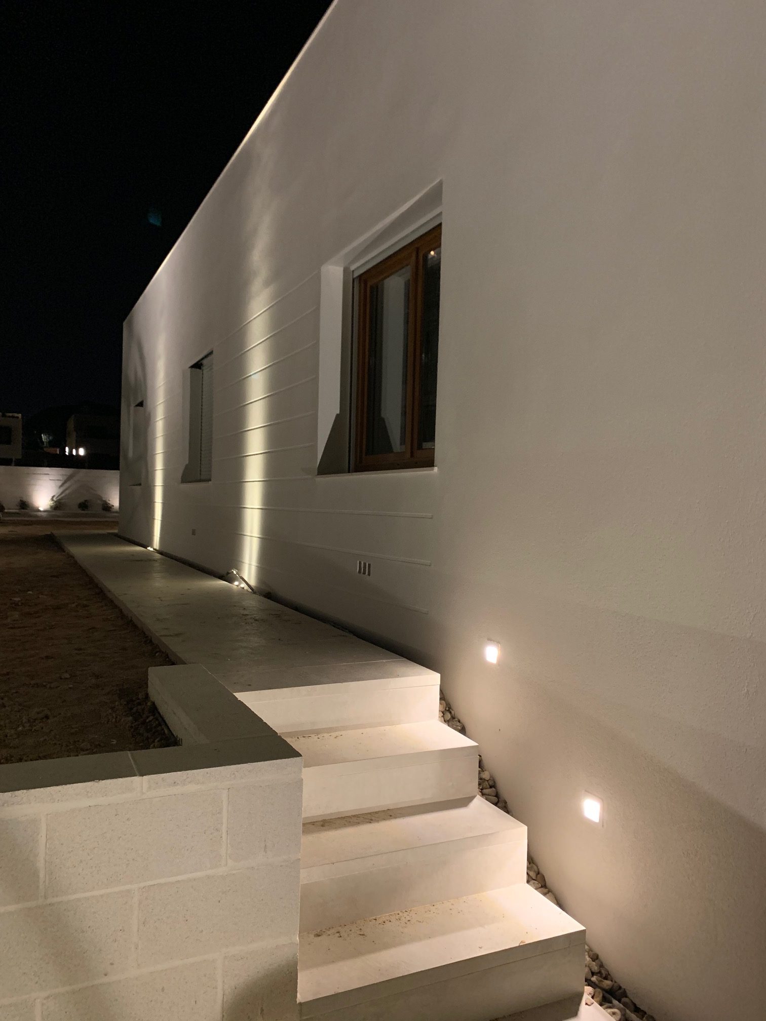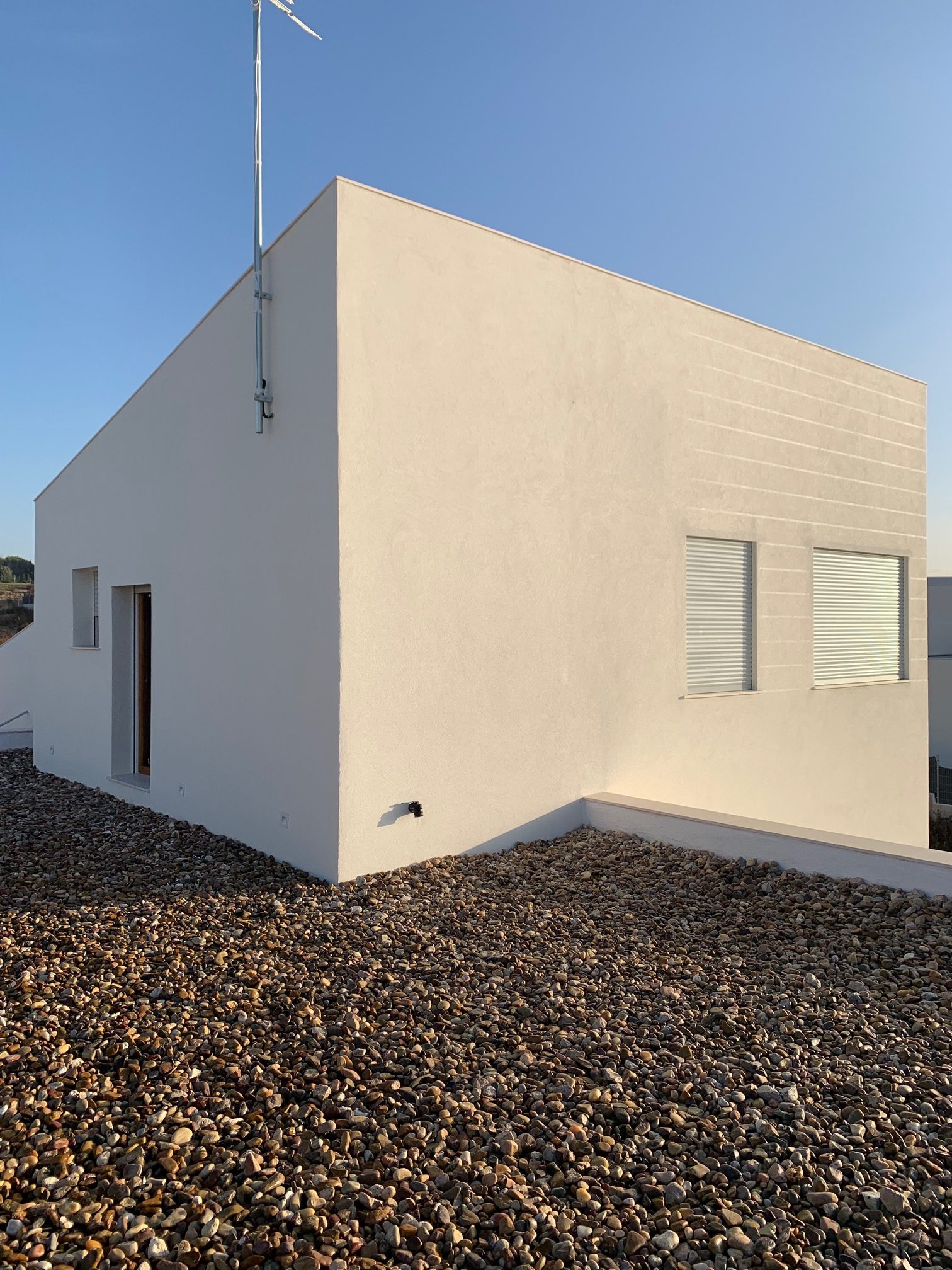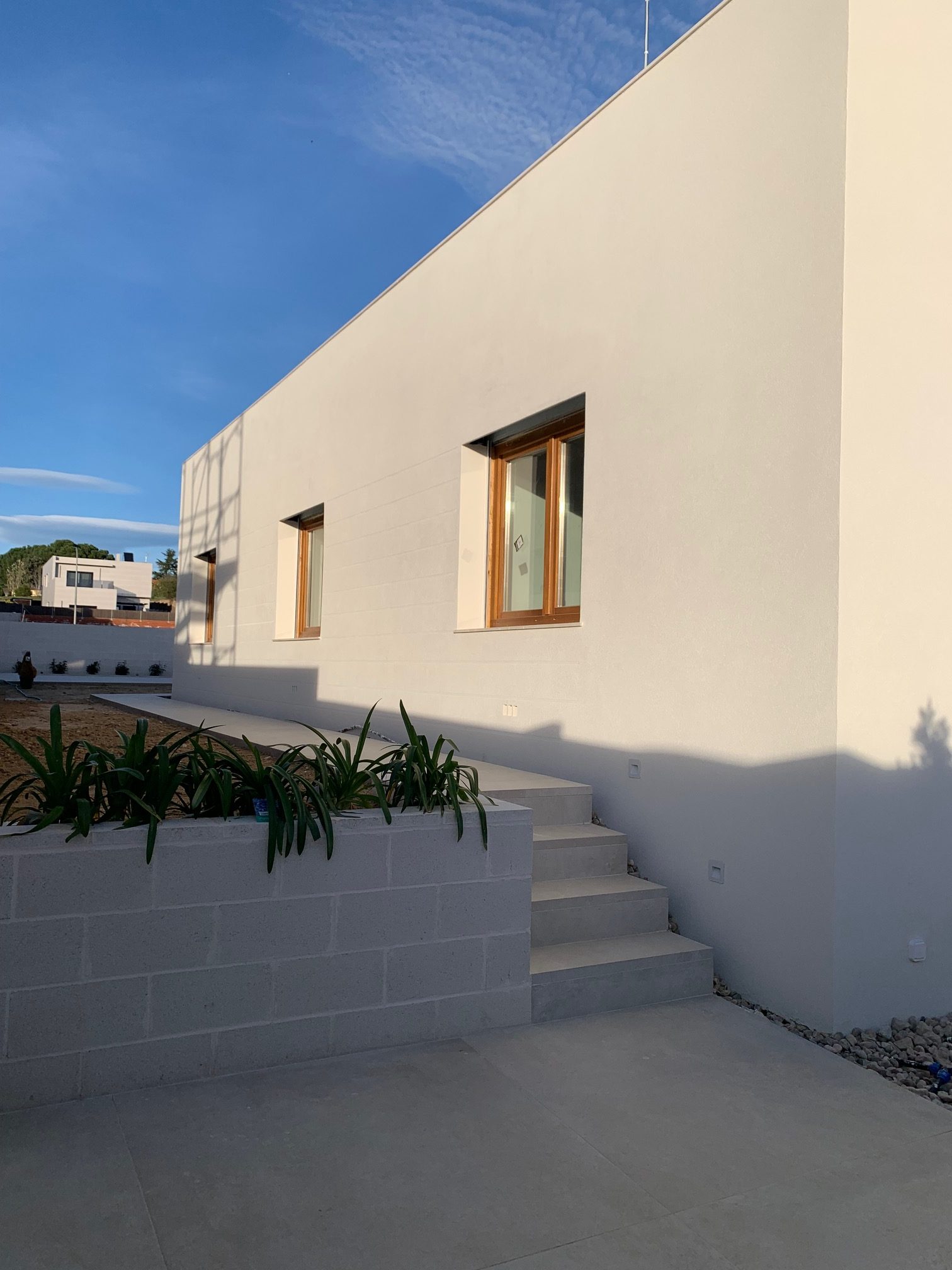 En cuanto a los materiales, se ha priorizado la calidad y la durabilidad. La carpintería exterior de madera natural de pino aporta calidez y un carácter natural que contrasta con la pureza de las líneas arquitectónicas. En el interior, la vivienda cuenta con carpintería de madera maciza lacada en blanco, que refuerza la luminosidad de los espacios y aporta un acabado elegante y atemporal.