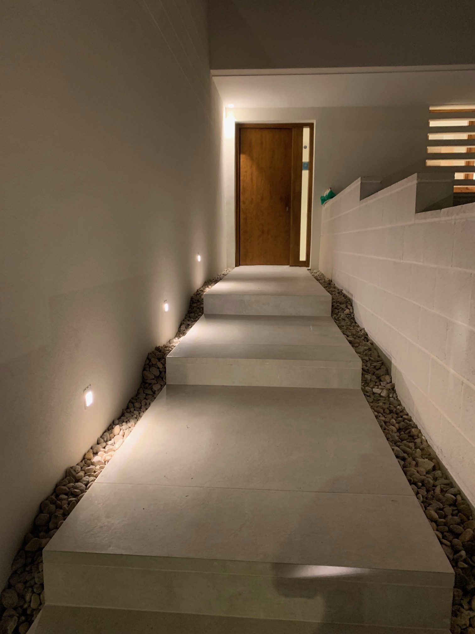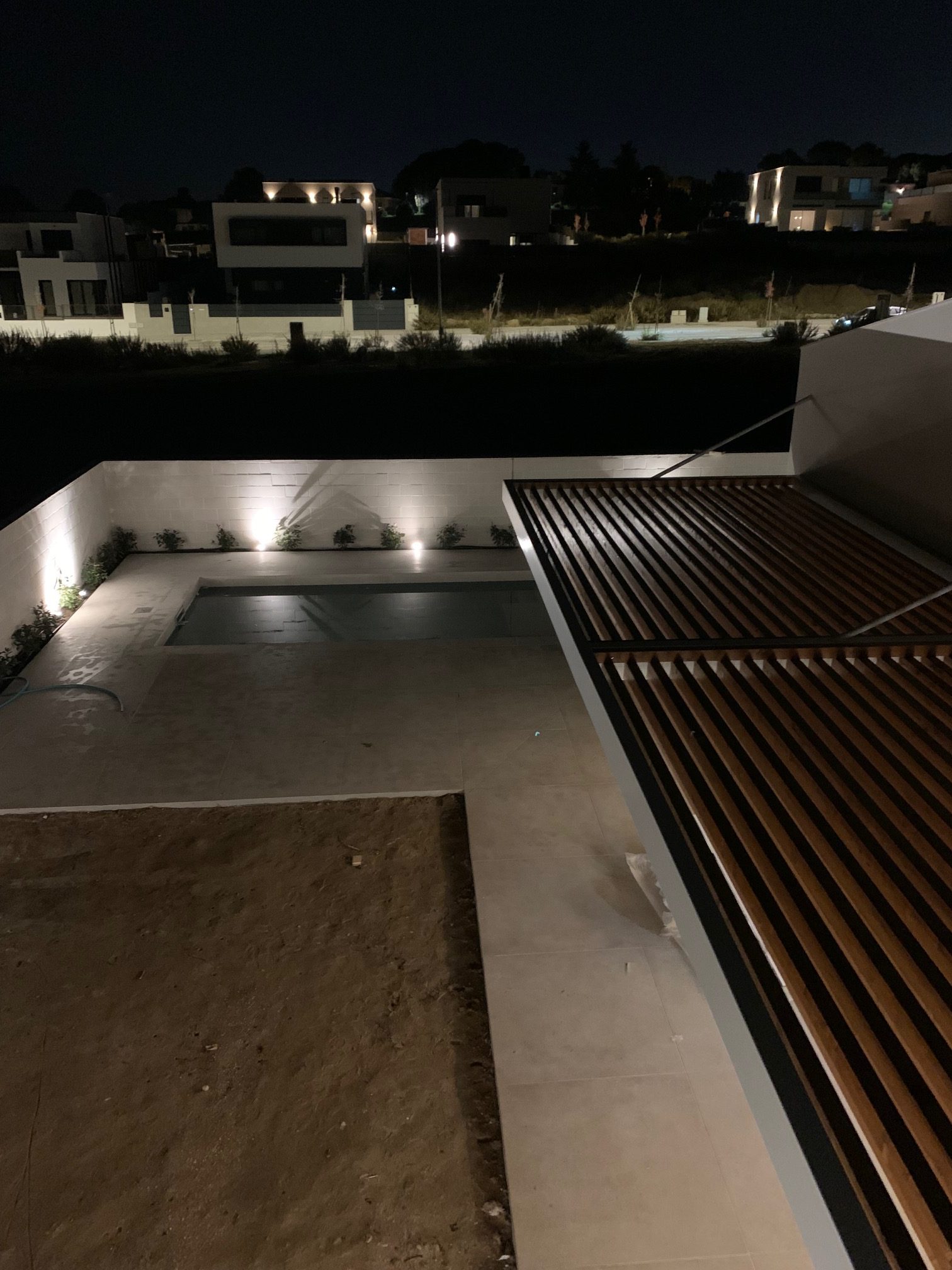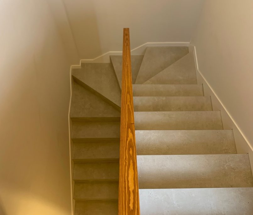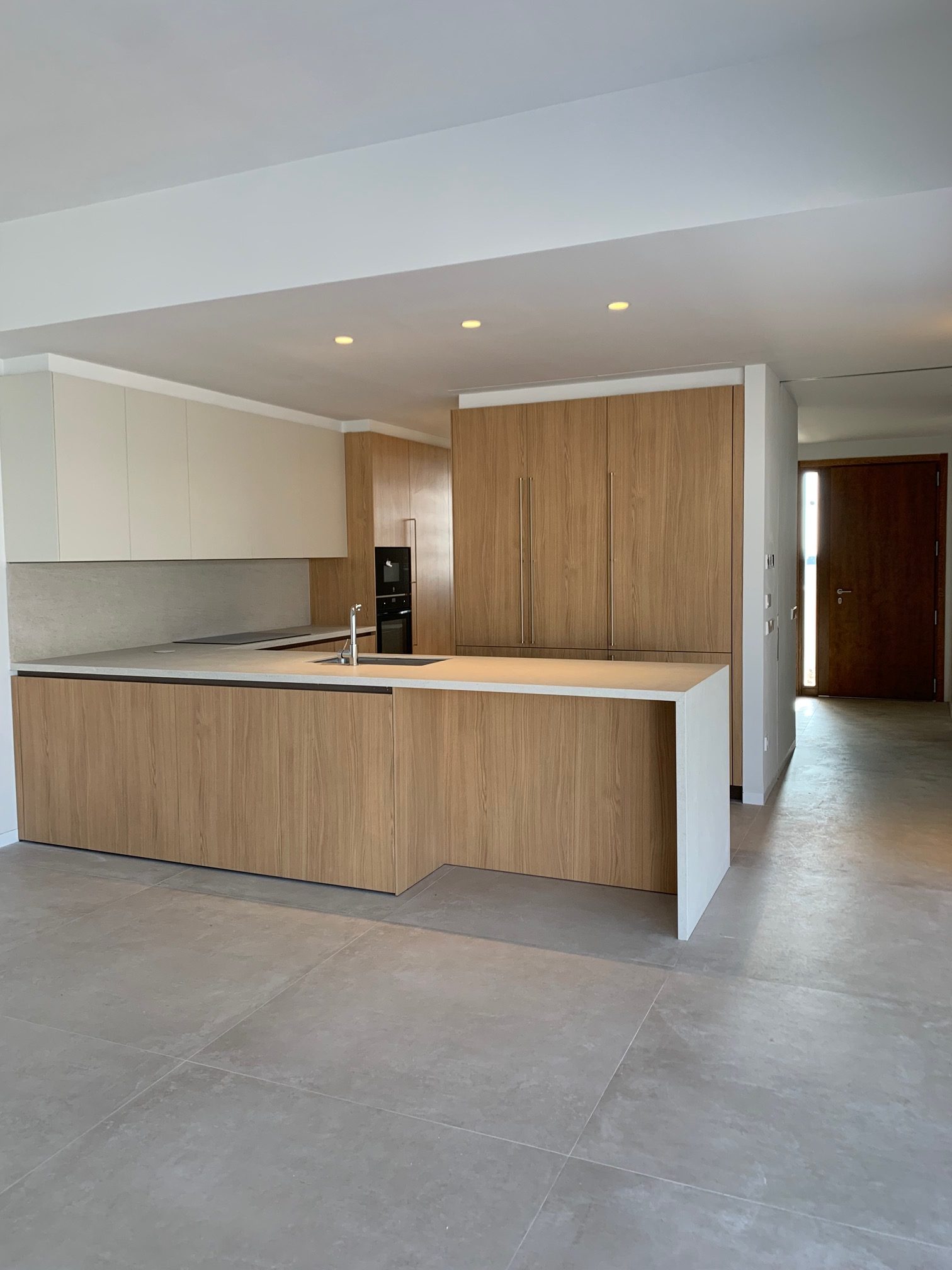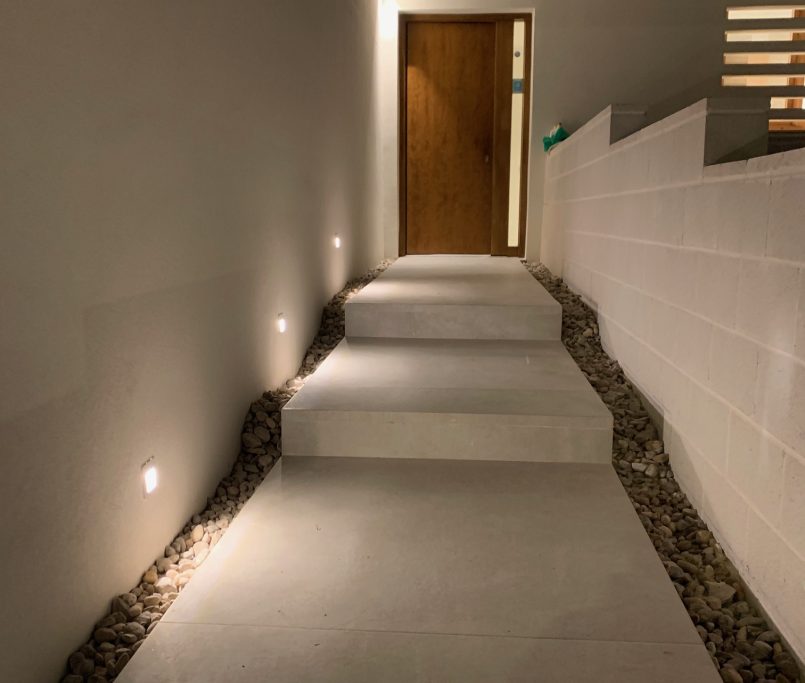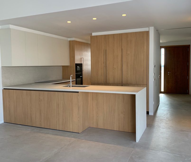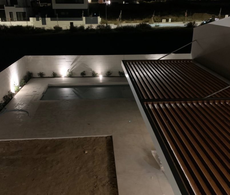 Los pavimentos y revestimientos se resuelven con porcelánicos de gran formato tanto en interior como en exterior, creando continuidad visual entre los espacios y aportando una estética contemporánea y sofisticada.