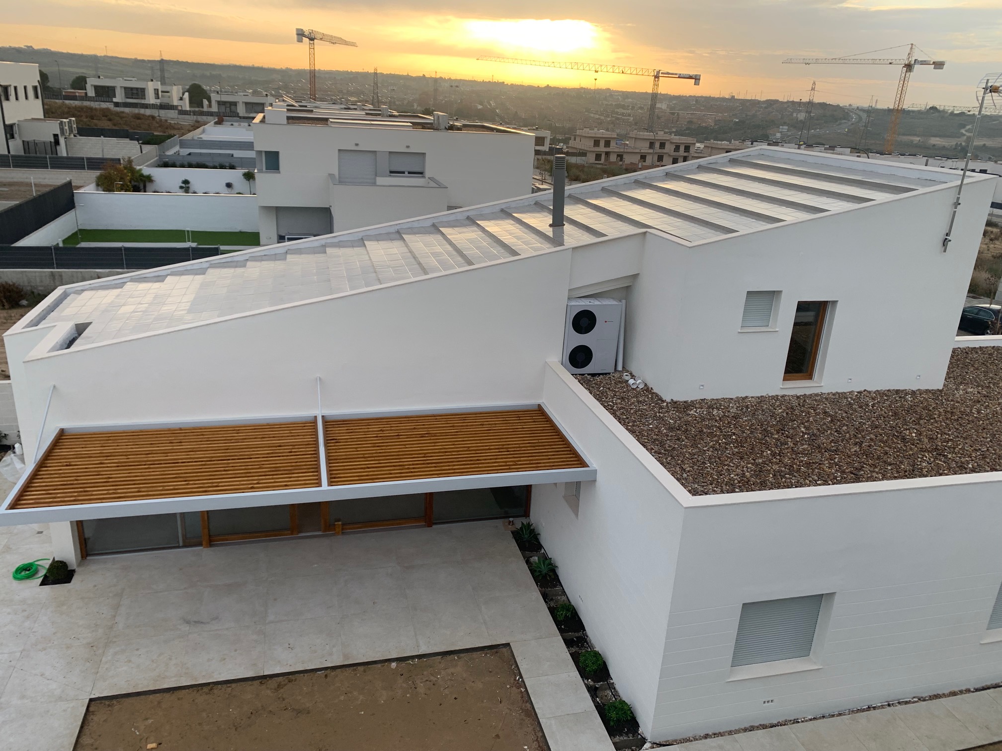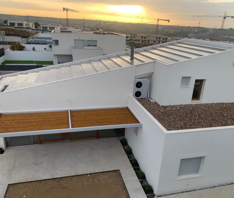 Uno de los elementos más característicos de la vivienda es su geometría exterior, donde destaca especialmente la cubierta inclinada, que aporta personalidad al conjunto arquitectónico y genera un juego de volúmenes limpio y elegante. Este diseño no solo define la estética de la casa, sino que también contribuye a su integración con el entorno residencial.